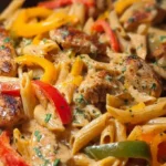 This Creamy Jerk Chicken Rasta Pasta brings Jamaican heat together with a silky, cheese-filled sauce for a comforting, flavor-forward meal. Bright bell peppers add sweet crunch and color while jerk-seasoned chicken delivers a smoky, spicy profile that pairs beautifully with the rich cream and melted cheeses. The penne soaks up the sauce so each bite is luxuriously creamy, with aromatic garlic and herb butter lifting the whole dish. This recipe is ideal for weeknight dinners when you want something quick and impressive, for casual dinner parties, or anytime you crave a satisfying, slightly spicy pasta that feels indulgent without being fussy. Expect a pleasing contrast of tender chicken, al dente pasta, and tender-crisp peppers, with a warm, garlicky aroma and a lingering jerk spice finish. Serve it hot and garnish with extra Parmesan if you like for an extra savory touch.