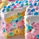 A cheerful, pastel-studded dessert blending light white cake with creamy white chocolate pudding and fluffy whipped topping, perfect for spring gatherings.